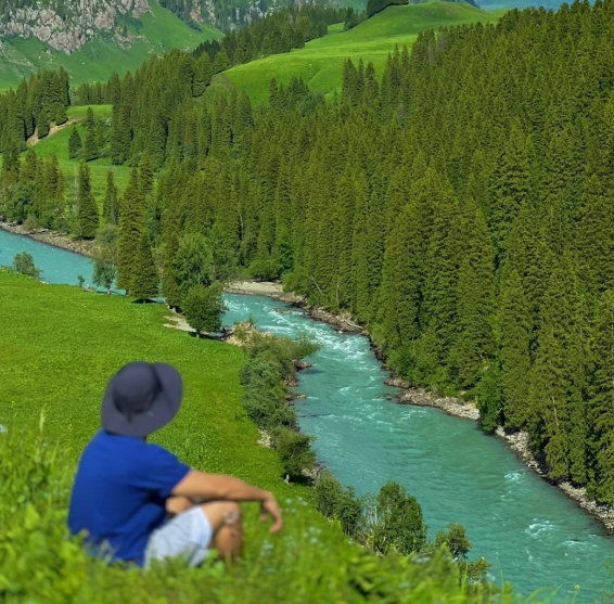 喀什河蜿蜒流淌,河水清澈见底,河岸两侧是开阔的草原和点缀其间的哈萨克牧民居所。清晨或黄昏时分,阳光洒在河面上,波光粼粼,牛羊漫步,宛如世外桃源。