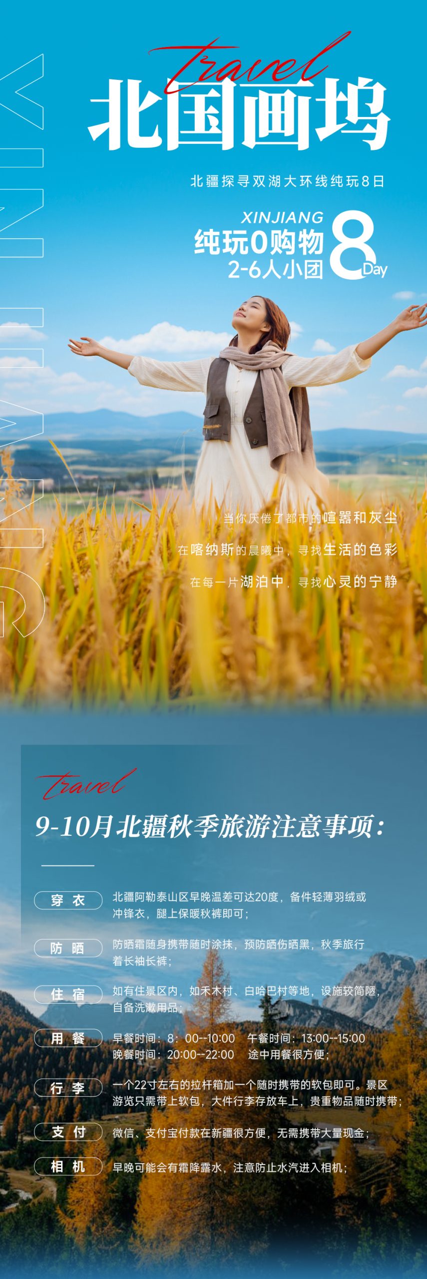 3、新疆和内地作息时间有2小时时差,时间还是用北京时间;吃饭睡觉时间都比内地晚 2 小时旅行在路上的时间较长 ,时常饭点还在路上 ,吃饭时间或早或晚,建议自备零食干粮水果和饮料 ,以备不时之需;也请带好保温杯红糖姜茶感冒药等,新疆比较干燥紫外线强烈准备好润肤露、 防晒霜;冬季白雪茫茫,务必带太阳镜保护眼睛;